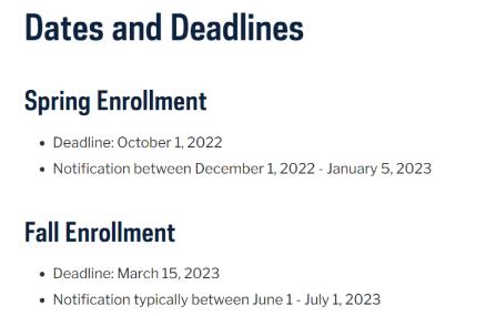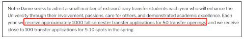 秋季入学申请是在3月15日截止,大约在6月1日-7月1日间发布录取,每年圣母大概有1000份秋季转学申请,录取名额50个。