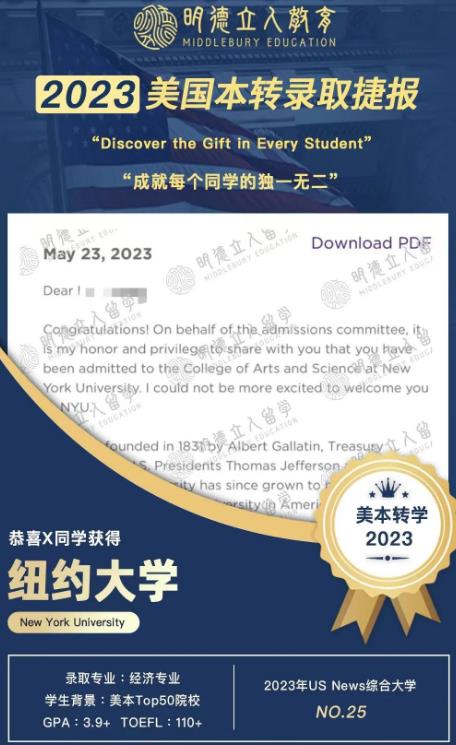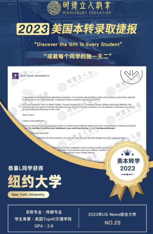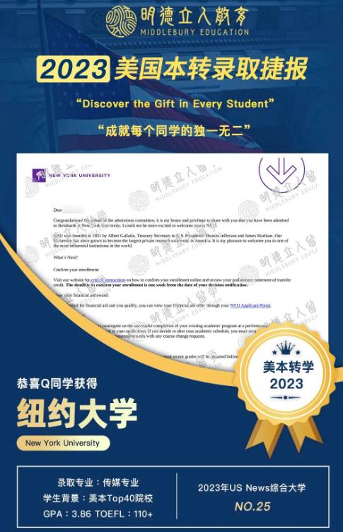 最近转学offer一来一大把,刚拿完4枚罗彻斯特大学,今天又来了4枚纽约大学的录取!