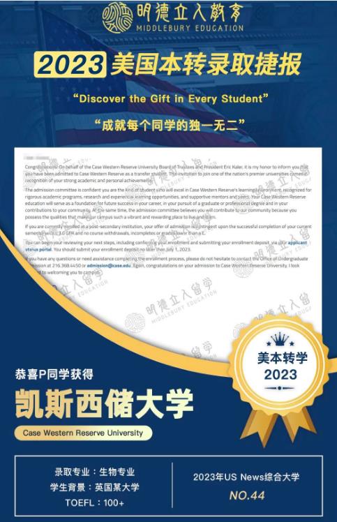 另外,来自英国某大学的P同学,斩获罗彻斯特大学后,又拿到了凯斯西储大学的转学offer!