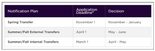 内部和外部转学生的夏季和秋季入学申请的日期会有一些差异。