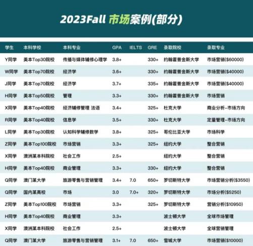 本科学校:美本TOP70背景条件:GPA 3.6+,GRE 330+;3段实习录取院校:JHU(市场营销究$40000)西北大学(项目管理)布朗大学(创新管理与创业)康奈尔(管理学$5000)