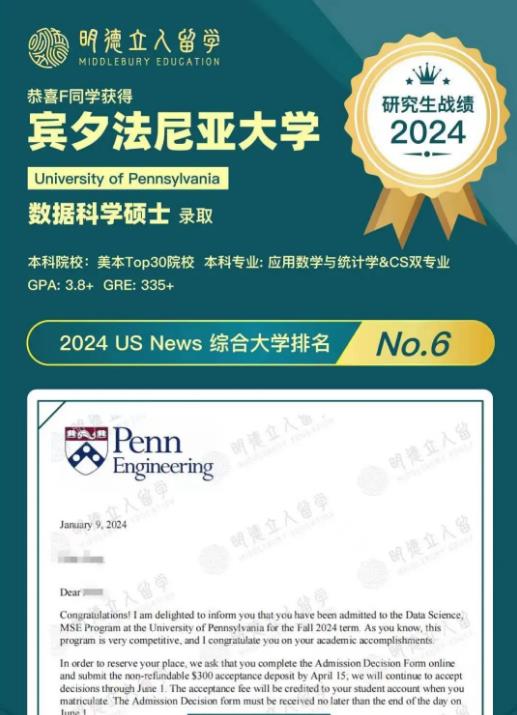 恭喜明德学子F同学,斩获全美TOP6宾大数据科学Offer!