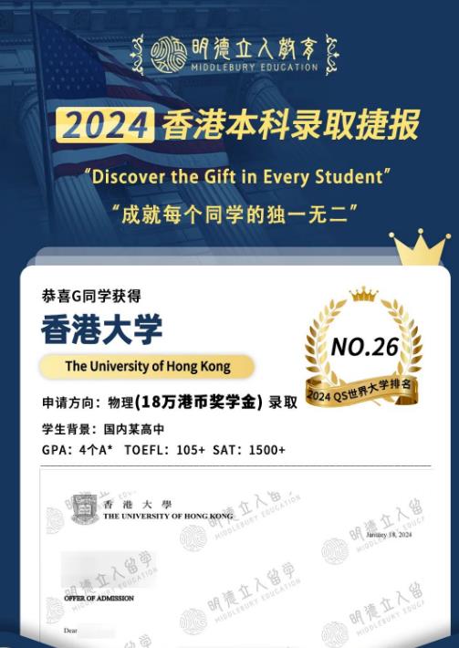 恭喜G同学GPA4个A*、TOEFL105+、SAT1500+,斩获香港大学offer!