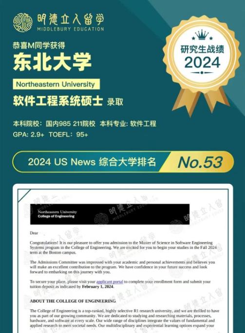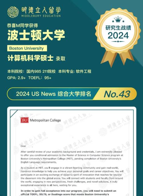 恭喜明德学子M同学,以GPA2.9+的成绩拿下QS TOP100波士顿大学计算机科学硕士offer,以及东北大学软件工程系统offer!