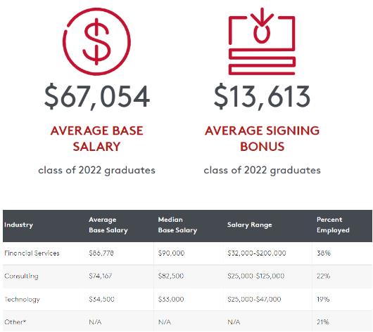 根据官网信息,毕业生6个月内就业率为84%,包括金融服务、咨询以及技术等,平均基本工资为67054美元。