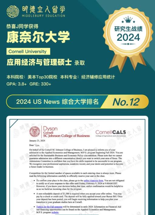 恭喜明德学子J同学继斩获JHU商业分析与管理、杜克大学MQM-BA之后,又强势拿下藤校康奈尔应用经济与管理Offer!