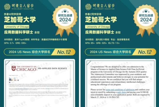 恭喜明德学子W同学与Z同学,成功在录取难度极高的DS赛道,强势斩获芝加哥大学的应用数据科学硕士Offer!