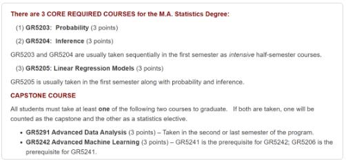 哥伦比亚大学统计学硕士项目课程结构严谨,涵盖了三门核心必修课、一门顶点课程和至少六门选修课程。