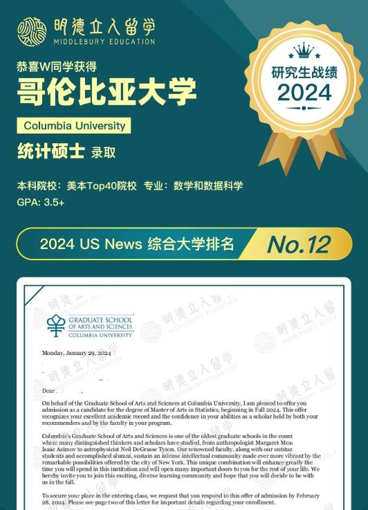 在明德本科规划团队老师的指导下,W同学成功牵手理想大学。