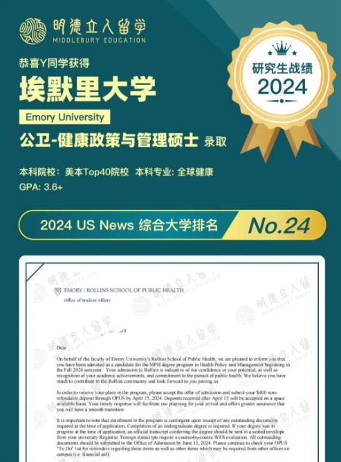 恭喜明德学子Y同学,斩获全美专排TOP4埃默里大学MPH-健康政策与管理硕士offer!