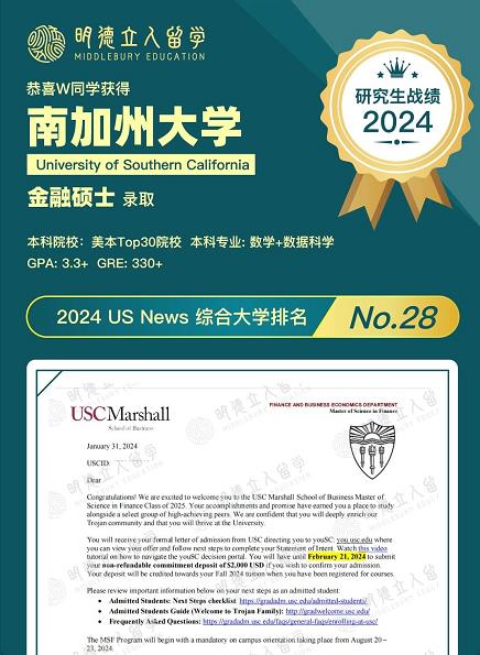 恭喜明德学子W同学继1月中旬斩获纽大量化金融后,今日又拿下南加大金融offer,录取就等于跨入名企!