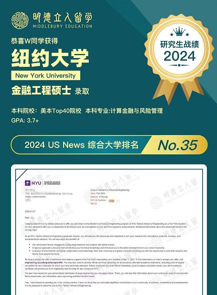恭喜明德学子W同学斩获专排#11纽约大学金融工程硕士项目offer!