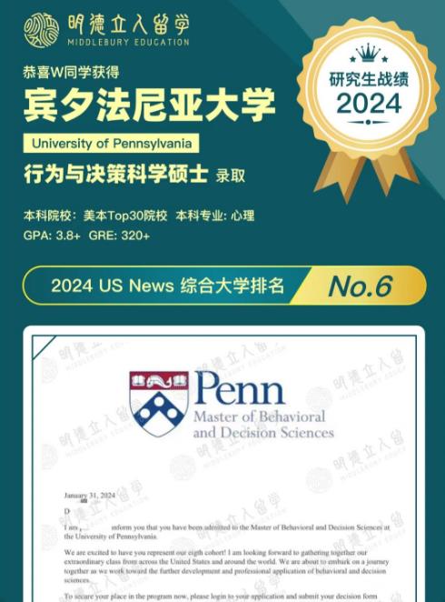 恭喜明德学子W同学用实力摘下藤校宾大的王冠,解锁“常春藤学霸”成就,从学霸修炼成Offer锦鲤。