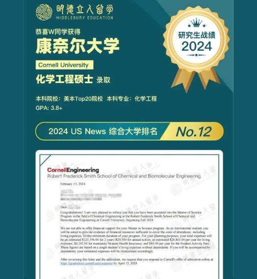 恭喜明德学子W同学,斩获藤校康奈尔化学工程硕士