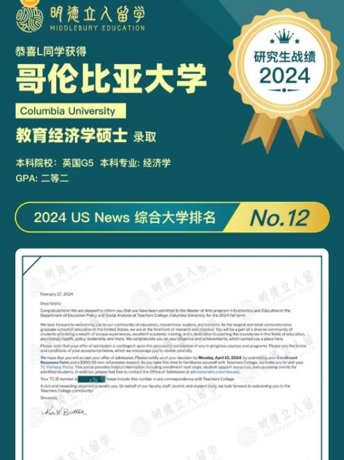 恭喜明德学子L同学成功跳出低分魔咒,以二等二学位斩获哥大教育经济学offer~