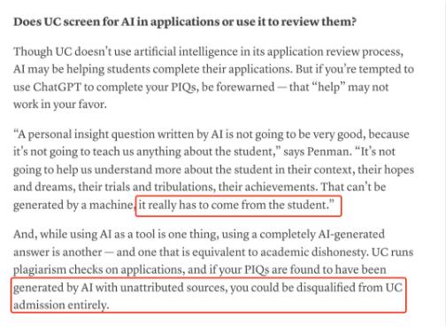 加州大学会对申请进行抄袭检查,如果发现在Personal Insight Question Response中是由没有注明来源的人工智能生成的,学生可能会被加州大学完全取消录取资格。